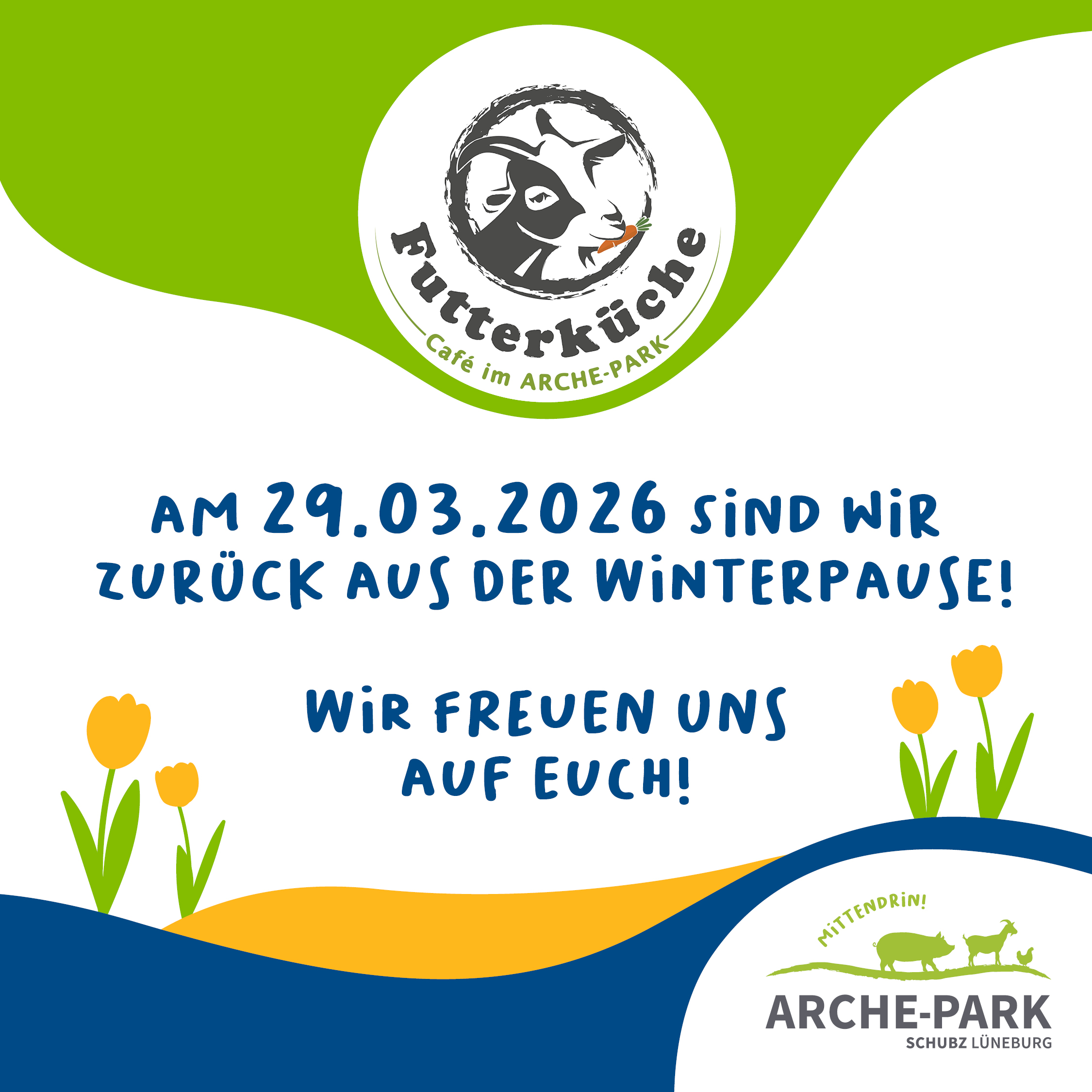 Unser Café „Futterküche“ macht noch Winterpause. Aber am 29.03.2026, melden wir uns mit dem ersten Aktionssonntag der Saison „Mitmach-Geschichte für Kinder“ zurück.